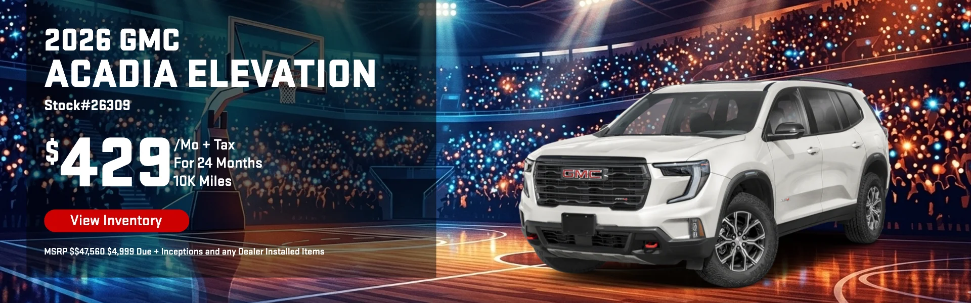 Internet pricing includes all applicable rebates and incentives. Customer must be a current lessee of a 2021 model year or newer GM or Non-GM. Customer must show proof of current lease. Each dealer sets their own price. This offer of $429/mo plus tax is based on stock# 26309, 2026 GMC Acadia Elevation with a MSRP of $47,560 for 24 months, 10,000 miles per year and requires $4,999 down plus any dealer installed items, any dealer provided benefits and inceptions are due upfront (first payment, upfront tax, tag, fees, and dealer fee). The online special is a plus tax figure. Special financing and leasing are based on approved A Tier Credit through GM Financial. Lessee pays for maintenance, repair, excess wear and disposition fee of $495 at end of lease. No security deposit required for A Tier approved credit. Payments may be higher in other counties or states. Not available with other offers. Online special available on in stock units only. Must take delivery by March 31, 2026.